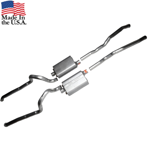 These systems use Performance Flowmaster Mufflers. Even though they do not use original style mufflers, all of the correct brackets have been welded on the system. This allows the use of original style hanger kits for a clean and excellent "factory" fit. Much nicer than a "universal" system. Tips required and sold separately. To listen to a Flowmaster muffler, go to http://www.flowmastermufflers.com/40_delta.html and click on "sound clip in LH middle of page. Use EH-322 Exhaust Hanger Kit with this system. This system has turn (dump) down style tailpipes so no tailpipe extension is used.